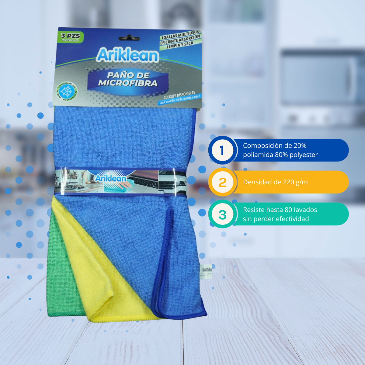 El paño de microfibra MICROLIMPIO de cuenta con una densidad de 220 gramos por metro cuadrado con gran capacidad de absorbencia gracias a su composición de 20% poliamida y 80% poliéster.