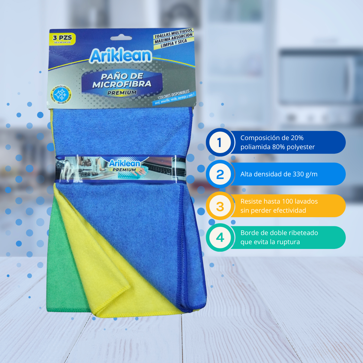 El paño de microfibra MICROPREMIUM cuenta con una densidad de 330 gramos por metro cuadrado con gran capacidad de absorbencia gracias a su composición de 20% poliamida y 80% poliéster.
